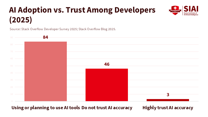 그러니까 학생들은 AI 도구를 다루는 것만으로는 부족하고, 프로젝트를 이끌고 결과물을 검증할 수 있어야 하는 것이다. 설문조사에 따르면 대부분의 개발자가 AI를 활용하지만 절반 가까이가 결과를 신뢰하지 않는다고 한다. 이용률이 높은데 신뢰도는 낮다는 것은 AI의 결과물에 대한 확인과 검증이 그만큼 중요하다는 사실을 가리킨다.
