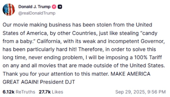 29일(이하 현지시각) 트럼프 대통령은 자신의 소셜미디어(SNS) 트루스소셜에 올린 글을 통해 “미국 밖에서 제작된 모든 영화에 100% 관세를 매기겠다”고 밝혔다. 다만 그는 해당 조치를 시행하는 시점과 방식 등에 대해선 구체적으로 설명하지 않았다. 이 같은 발언은 상품이 아닌 서비스 영역에 관세를 적용하려는 첫 번째 시도로, 실제 집행 가능 여부를 떠나 미국 영화 산업 전반에 불확실성을 키우는 요인으로 작용할 전망이다.