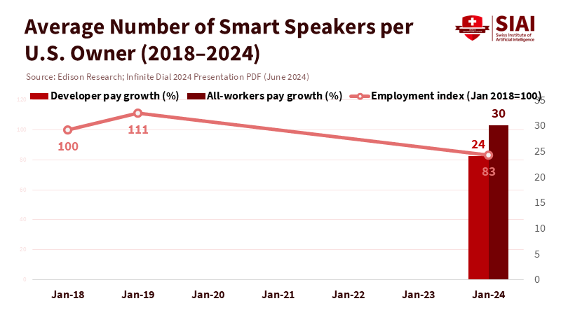 주: 개발자 임금 상승률(%), 전체 근로자 임금 상승률(%), 개발자 고용 지수(2018년 1월=100)(보기 좌측부터)