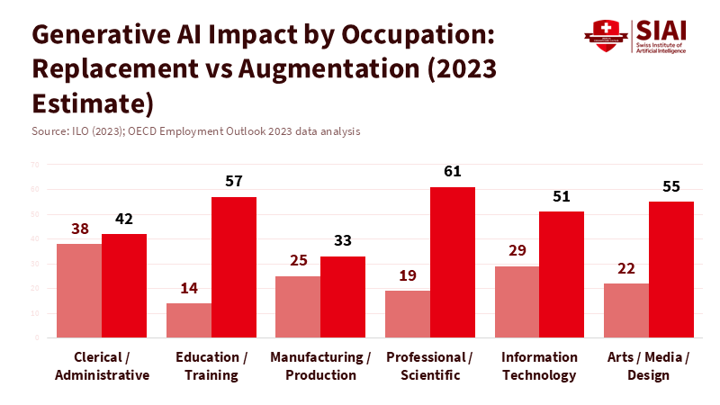 주: AI로 인한 대체(좌측 막대그래프), AI로 인한 보강(우측 막대그래프) / 사무 및 관리직, 교육 및 직업 훈련, 제조 및 생산, 전문직 및 과학, 정보 기술, 예술/미디어/디자인(좌측부터)